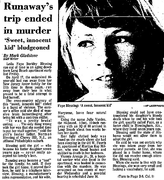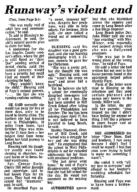In the process, I learned that on June 2, 1978 (the day prior to this UID being found), a teenage runaway from Cherry Hill, NJ, named Leila Faye Barkley Blessing was found murdered in a Long Beach apartment. Ms. Blessing was believed to have run away from the Mill Creek School (a school for emotionally disturbed young people in West Philadelphia) on April 17, 1978 with a boy who was also a student at the school. The missing boy is not named in the Long Beach Independent article from June 8, 1978. View attachment 57367View attachment 57368