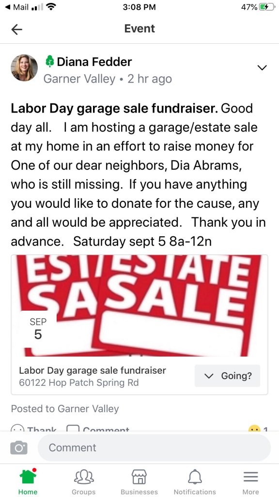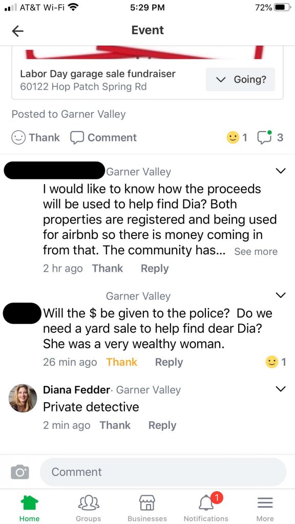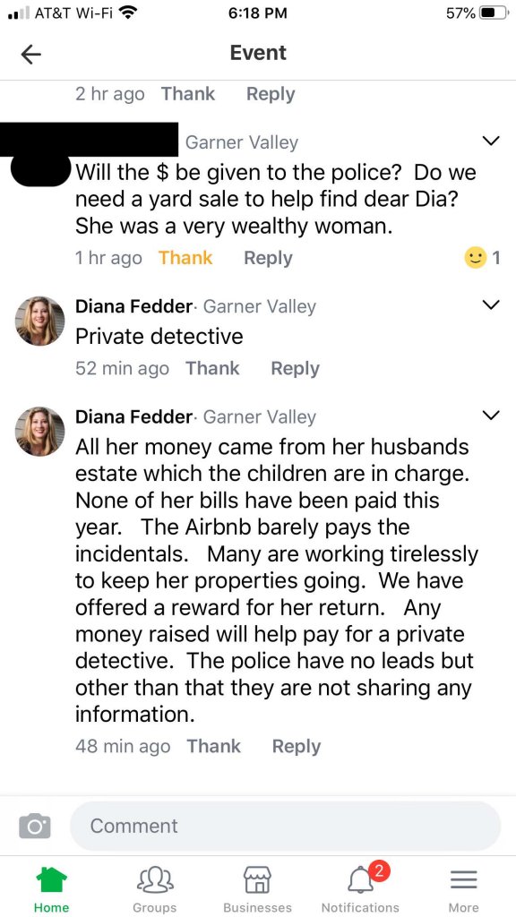 In the images below, when Dia goes missing Diane Fedder immediately claims to be the power of attorney and says to have all information and details go to her. She sets up a sale to sell Dia's stuff right after she goes missing. Diane Fedder claims she will hire a private detective. To my knowledge a private detective was never hired by Keith Harper and/or Diane Fedder. Keith Harper only ever mentions the free psychic service that he used. Diane Fedder then claims that "we have offered a reward for her return." The only reward that was put out was from Keith Harper of $10,000 "for her safe return." They knew that she was never going to return safely.