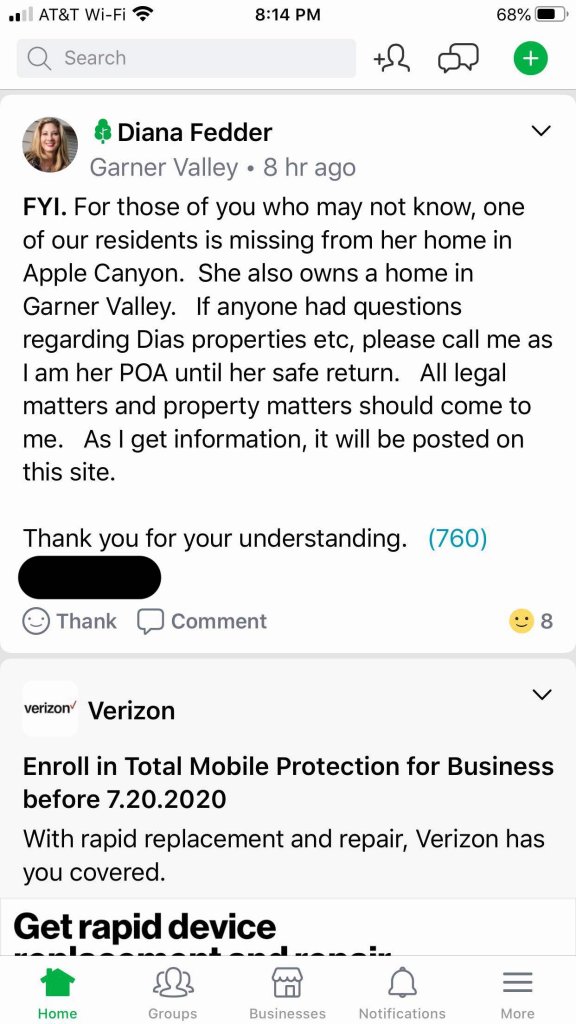 *Probate Settlement Hearing (@ 8:45am PT in Palm Springs) - CA – Lydia “Dia” W. Kenshalo Abrams (65) (last seen @ 2:30pm June 6, 2020 from her 117-acre Bonita Vista Ranch, in a remote area east of Mountain Center, Idyllwild; vehicle, handbag, keys & cell phone still at home. Not found. DOB 7/6/54).