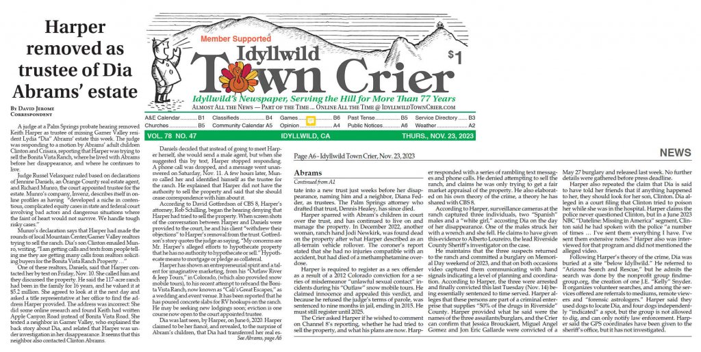 9/14/23 Update: Riverside County Superior Court Judge Russell Moore ordered Harper to turn over a long list of accounting records related to Abrams’ estate by 9/22/23. Judge Moore then set a 11/5/23 hearing date on a motion filed by Invenz to remove Harper as co-trustee of the Abrams estate. “We know that there's income being derived there. We don't know where it's gone. We know there was a lot of money spent. We don’t know how it was spent. Mr. Harper indicated he's loaned money to the estate. We have no idea what those loans are, nor any evidence of that,” attorney Michael Wachtell told the judge. 11/5/23 is a Sunday, so putting it on 11/6/23.