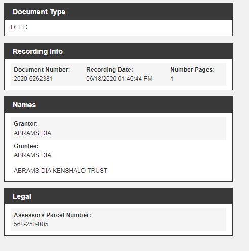 It appears from the last pages of the PDF above that the property taxes are being paid by the mortgage company through an escrow account. Those documents prove multiple mortgage payments were missed on both properties. Does that mean DF was being untruthful during the phone interview when DF told the reporter that she has made all the mortgage payments