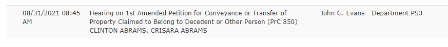 3/14/21: Dia’s children (Clinton & Crisara) have filed (on 2/26/21) a petition (#PRIN2100297): For Dia Kenshalo Abrams Trust: Petition to confirm Trust property; to compel production of accounting & Trust records; for removal of Trustees (Harper & Fedder); for subcharge damages for breach of fiduciary duty; for double damages; and attorney’s fees & costs. Probate hearing in Palm Springs (Riverside County) on 5/13/21 @ 8:45am.