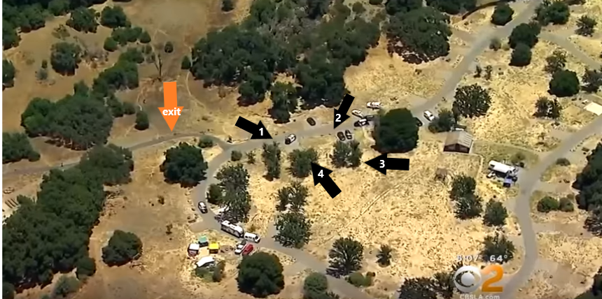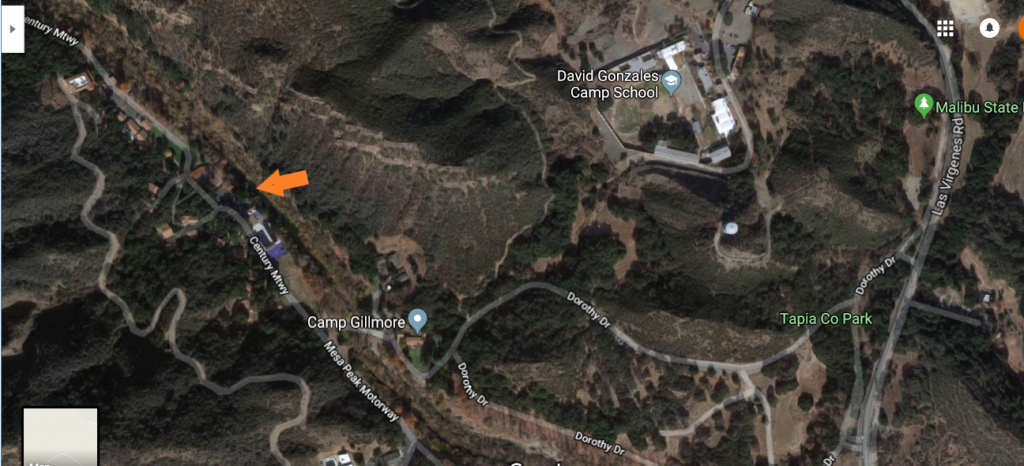 A possible exit route, after the shot, could have been Campfire Center Path. The perpetrator could have traveled down Crags Rd to Century Mtwy. It would have allowed him to evade being seen if police vehicles, ambulance or other responding personnel entered through Park Entrance Road. Does anyone know what the buildings are on Century Mtwy close to Mesa Peak Motorway (the third aerial map designated with orange arrow)? I noticed that it is close to Tapia Park where JR was shot.