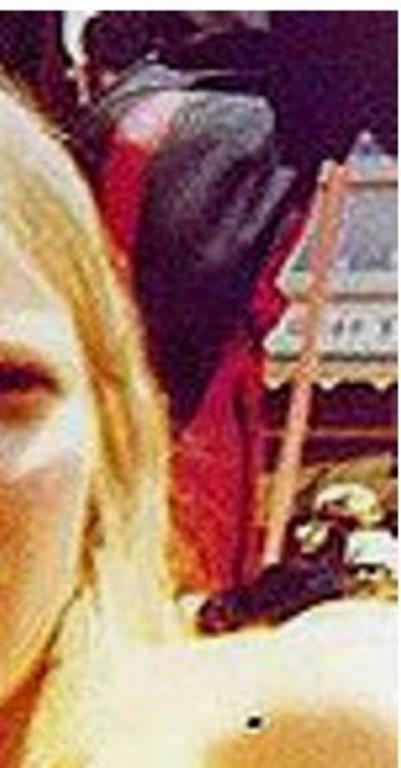 I agree, there is a man to the right of the easel leg in the photo sitting off in a distance., with a mustache and sunglasses with a white thing on his head to the upper left of him is a clown face with big ears and a red nose. The red pants with the stripe (sweat suit) behind her and a matching red jacket. Then it looks to me as if he has a black cape, scarf or throw on him, actually a black partial costume over the red jump suit. Could it be a photo from a theme park or something? or a Harley rally or outdoor festival? That black mark on her shoulder is in the photo when I zoom it.