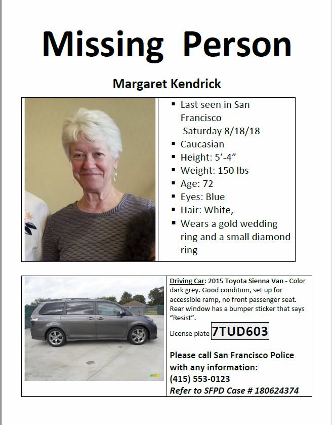 Margaret Kendrick is the mother of a BORP power soccer player and is missing. Please share the flyer below and contact the San Francisco Police with any information (415-553-0123)