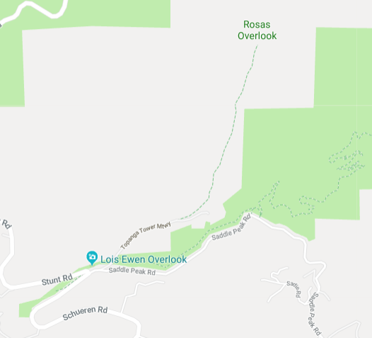 The "Topanga Tower Motorway" peels off from the paved Lois Ewen Overlook and you must enter it through a gate. The Topana Tower Motorway us paved for a bit but then turns into a very rough, rocky fireroad which is shown by a dotted line on the map. It ends at the "Rosas Overlook". (New name to me: I've always heard it called the Topanga Fire Lookout.) Same thing, same place but the "Topanga Tower Motorway" gets its name from the fact there used to be a fire lookout tower out there.)