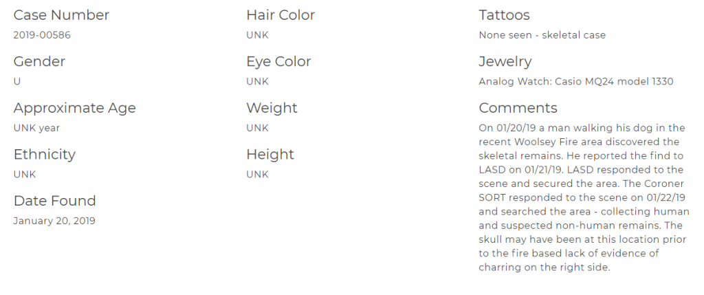 It sounds like Malibu LE gives up on IDing remains if there isn't find a drivers license in the pocket.