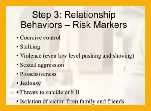 Concerning behaviors becoming more frequent, concerning behaviors becoming more serious or severe, stalking (even low-level), threats to kill or suicide, may use language like "I won't let you leave," "I can't live without you," If I can't have you, no one will."