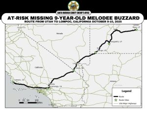 Lompoc, Calif. – Santa Barbara County Sheriff’s detectives are sharing additional information, a route map, and photo that includes Ashlee Buzzard in their ongoing search for missing at-risk 9-year-old Melodee Buzzard.