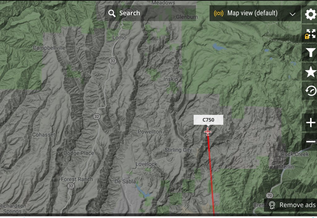 This photo is a screen grab as I’m watching a Cessna 750 flyover Stirling, CA headed north to Inskip, CA. Very rugged terrain.