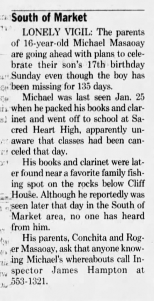 Authorities believe that Masaoay was abducted by person(s) unknown. His duffel bag was located sometime after his disappearance at the northern end of Bakers Beach, California. The bag had been placed underneath a rock and was identified by his parents. Inside was part of his clarinet. There has been no further sign of Masaoay since 1989.