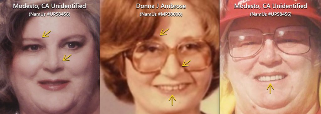 After being missing for seven months, Donna J Ambrose was reported to have went missing around November 1989 in Cleveland, OH. Twenty-nine years later, on October 6, 2018, this unidentified deceased female was found in Modesto, CA, appearing to conceal her identity.