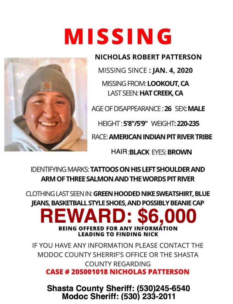 Nicholas “Nick” Patterson, was last seen in Hat Creek, Ca., is a Atwamsini (Pit River) tribal member. He has been missing since January 5, 2020.