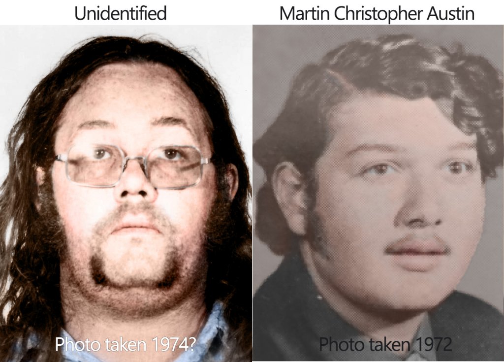 • At the time Martin went missing in 1974, he was described has having long, dark brown hair, and a full beard and mustache (dark brown), and in his 1972 photo, he had sideburns. This aligns with the unidentified's photo.