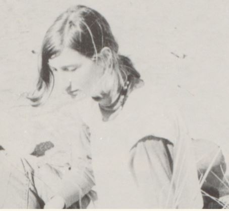 Long-sleeved red velour blouse,possibly with black horizontal pattern. May have had long sleeved blue sweatshirt over the blouse. Probably wearing green corduroy slacks but may have been wearing blue jeans