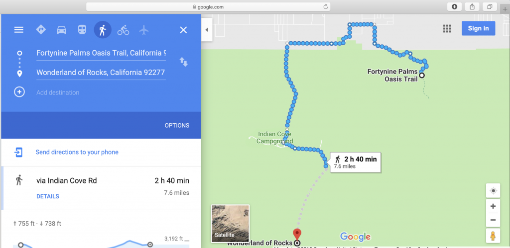 How long a hike from the trailhead of Fortynine Palms Oasis Trail to Wonderland of Rocks?