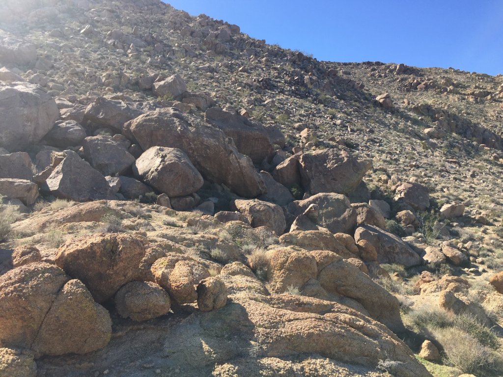 View attachment 166981 View attachment 166981 This is a small wash that crosses the trail about 2/3 of the way to the Oasis, running to the Northwest. It's the only attractive alternative route I see on the trail and if Paul was looking for Big Horn Sheep this looks like a good place to look. Also I did see Big Horn Sheep droppings as I hiked up . I reached the end in less than an hour and continued up to a small peak to the North and from there I could clearly see the parking lot. If Paul had seen the same thing he may have attempted to hike down the mountain and fell off a cliff.