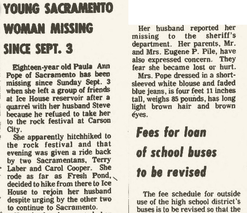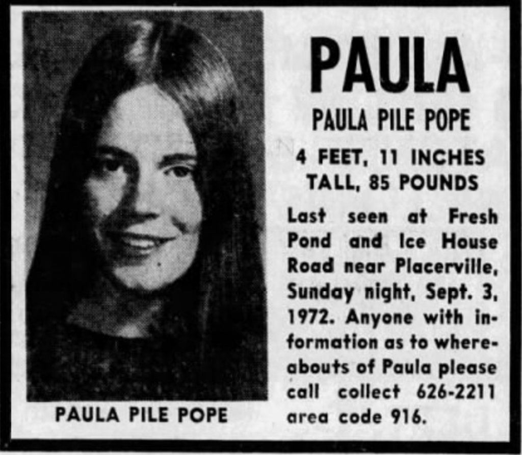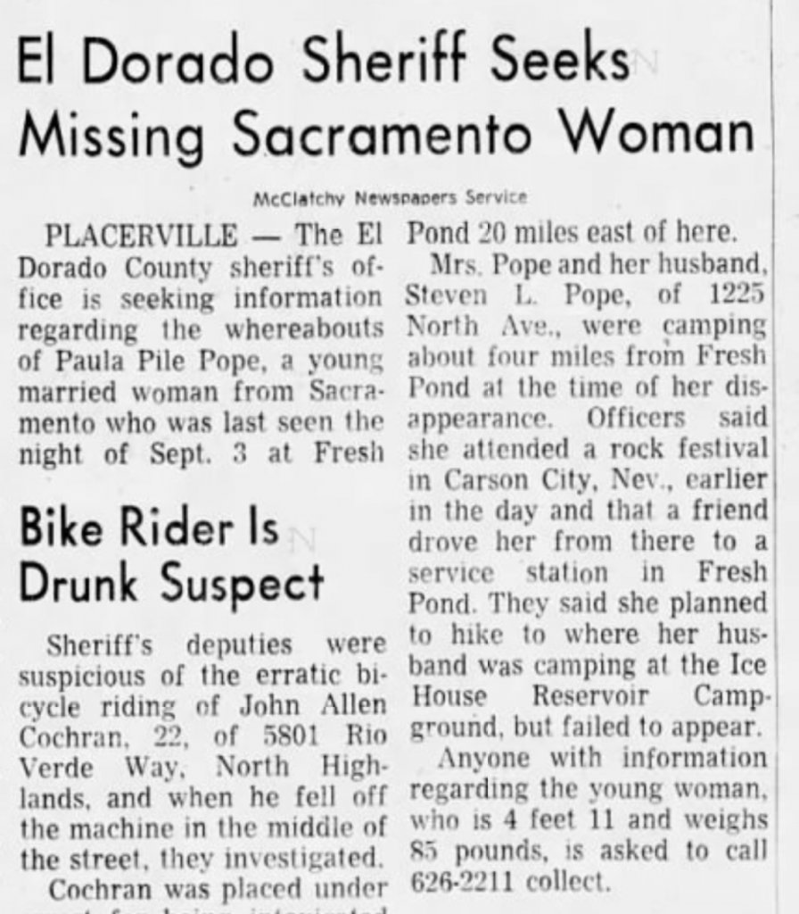 Pope was last seen in Fresh Pond, California on September 3, 1972. She was camping with her husband and some friends at the Cripple Creek Campground.