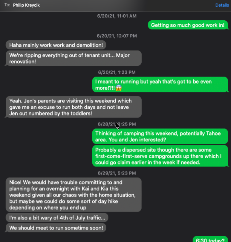 And just a quick thought in regard to the texts and how well they knew each other, etc.... I will say that the running community is a bit unique in that there are many people that I have spent hours and hours (Days cumulatively really) running with but have never been to their house, met their partners, seen their kids, etc. I feel that I know them quite well after hours together on a trail, but I know absolutely zero about many sectors of their life. It's not weird at all for me to text somebody and try to grab a run together and then not talk to them for 3-4 weeks until we try it again. It's just kind of the way the trail social scene works.