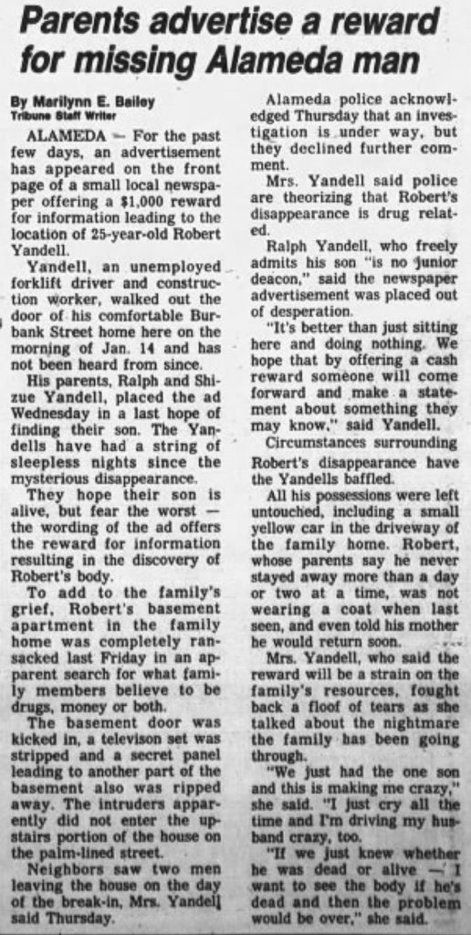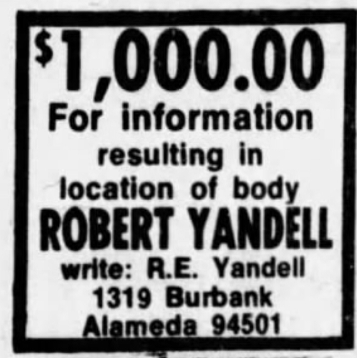Details of Disappearance: Yandell was last seen in Alameda, California on January 14, 1983. He has never been heard from again. Few details are available in his case.