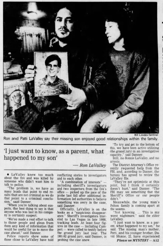 His roommates provided several different stories as to what had happened to him. At one point they said he'd been abducted and murdered by "biker types", a story one of them later characterized as just a "bad dream." Another another time they said he had moved to Las Vegas, Nevada, a story that turned out to be false. His roommates told police that La Valley had been using cocaine and marijuana regularly and that he was involved in small-time burglaries. His father knew La Valley smoked marijuana, but says it was for medicinal purposes.