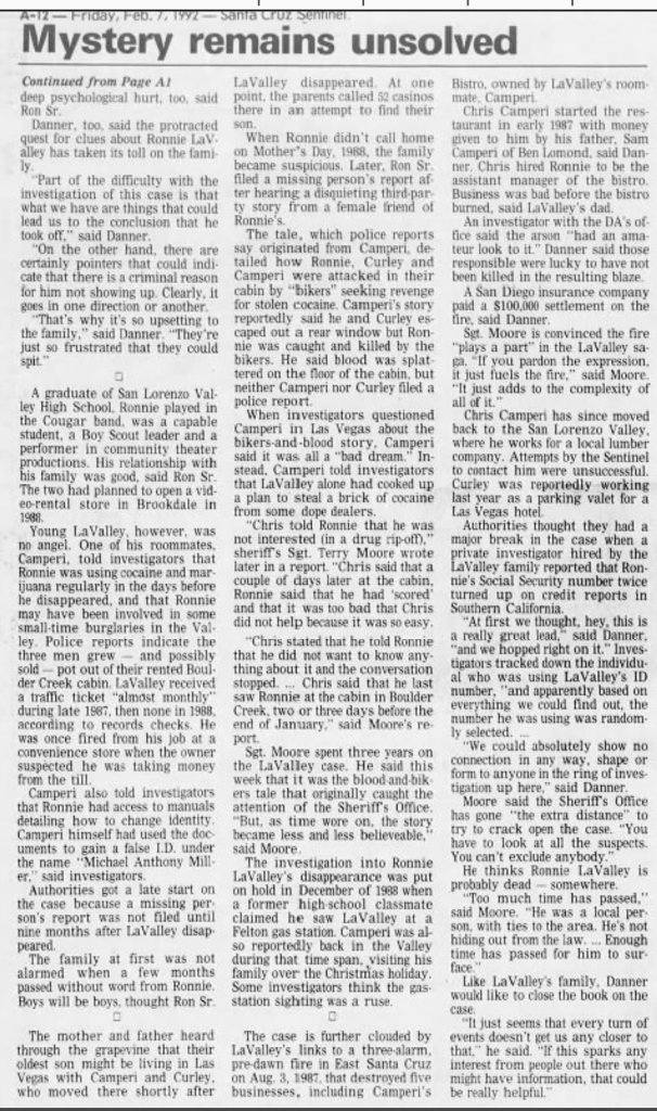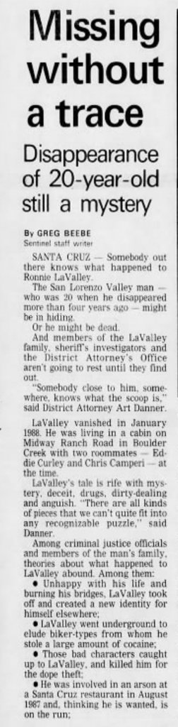 La Valley was last seen at his residence in the 400 block of Midway Ranch Road in Boulder Creek, California on January 25, 1988. He lived there with two friends. He has never been heard from again.