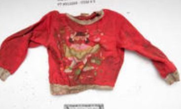 French Toast brand, size 3T), a green sweatshirt with "Winter Fever" and a cartoon surfer on the front ("Worm_El" brand, size 8), and a long sleeved red sweatshirt with a cartoon girl with ponytails and pink heart sunglasses on the front (size 5). Long sleeved tan/black/red casual shirt (adult size extra large) with "Kamikaze" printed on the front and "Racing Team" printed on the back. 14 fragments of a red satin-type cloth, fragments of red mesh cloth and fragments of a red ribbed cloth.