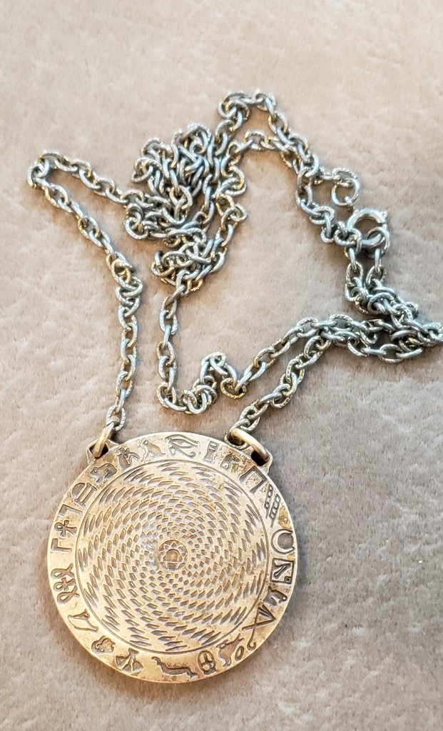 Around the neck was a round-shaped pendant, approx. 4" in diameter, with a blue back-ground and gold circles, and he wording "Pat Flanagan Experimental Sensor 24k," inscribed on the edge of the pendant.