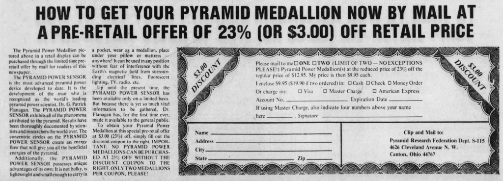 Don't know what version of the pendant this young man was wearing, but price could range anywhere from 10$ to 279$ given an article in The Atlantic Constitution, 9 Apr 78, pg 208 - snip below, which also mentions products contained a serial #. The article is some 4 pages long - this small snip does give a little background in the intro on the inventor.
