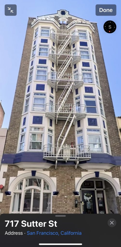 I know this is a really old post I’m responding to, but here is a current Google image of 717 Sutter St. and it does appear to be 6 stories. There was speculation she could have fallen/jumped from the roof to get the height reported as 7 levels.