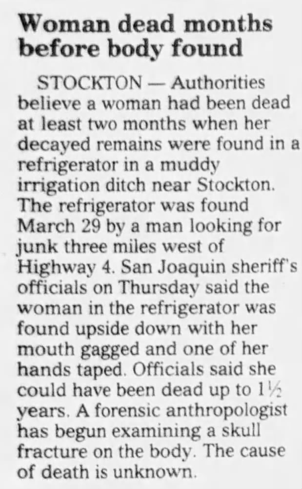 "Woman dead months before body found," Modesto Bee, 8 April 1995, B2.