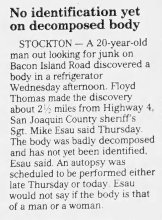 "No identification yet on decomposed body," Modesto Bee, 31 March 1995, B2.
