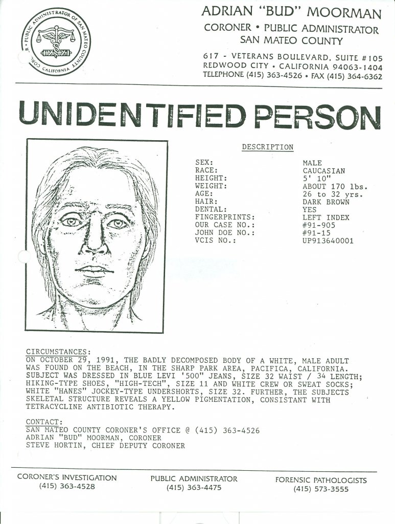 On October 29, 1991, the remains of an adult Caucasian male was discovered on the beach, in the Sharp Park area, Pacifica, California.