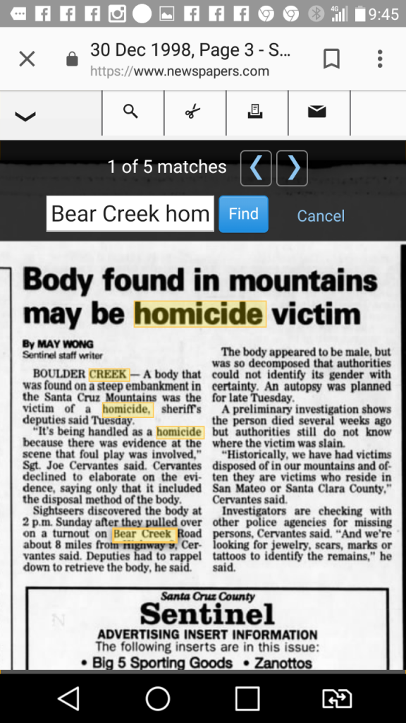 The victim was discovered on December 27, 1998 in Santa Cruz County, California