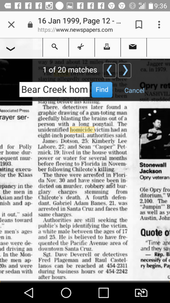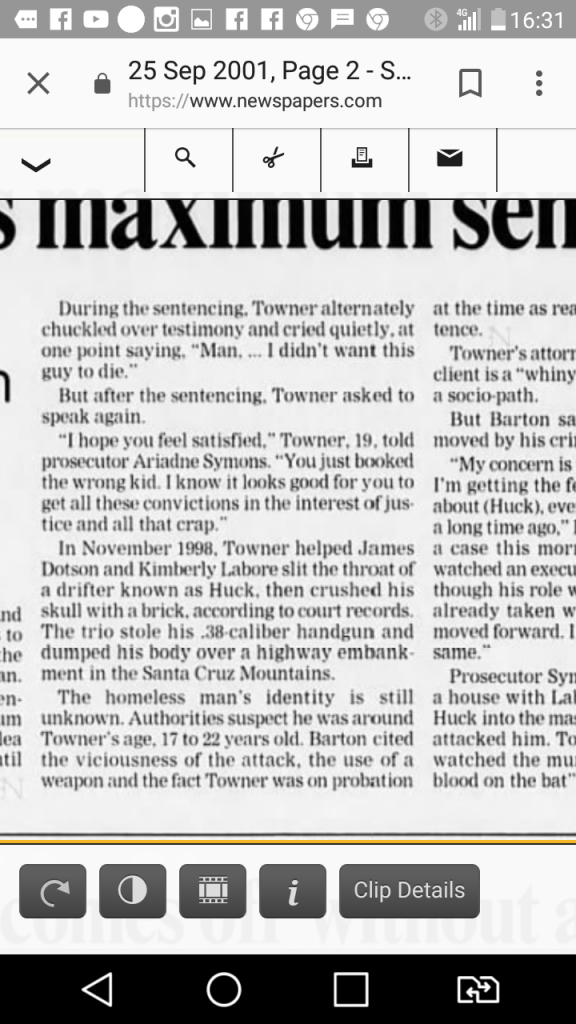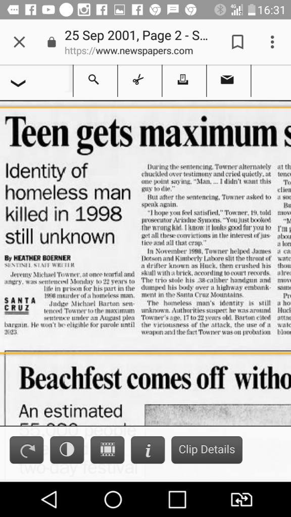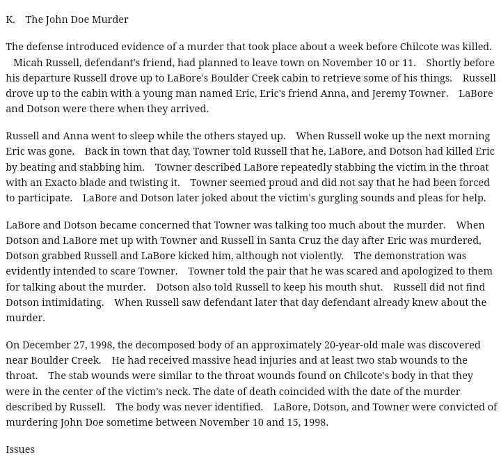 On December 27, 1998, the decomposed body of an approximately 20-year-old male was discovered near Boulder Creek. He had received massive head injuries and at least two stab wounds to the throat. The stab wounds were similar to the throat wounds found on Chilcote's body in that they were in the center of the victim's neck. The date of death coincided with the date of the murder described by Russell. The body was never identified. LaBore, Dotson, and Towner were convicted of murdering John Doe sometime between November 10 and 15, 1998.