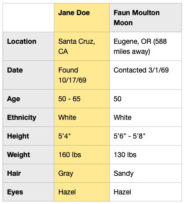 The body was of a 50-65 white female with light complexion, short gray hair (2-2 1/2 inches), with brown or Hazel eyes.