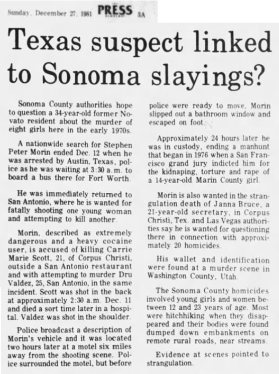 Hitchhiking was very common in the area at the time but it created opportunities for predators and the Hwy 101 corridor, that went right through Santa Rosa, was a particularly good area for hitchhiking. The region was considered very tolerant of the hippy lifestyle. While the number of murdered young women who fit this pattern was clearly higher in the Santa Rosa area than other parts of the Bay Area, the availability of young women hitchhiking in that area was also much higher. In the days before DNA, the bodies of young women dumped off of isolated roads usually lacked any clear markers or signature. Law Enforcement could never be sure which ones were connected. There were plenty of known SKs who operated in that part of the state at the time as well as a few unknown ones. There were certainly some predators who did it once or twice and stopped.