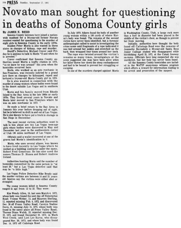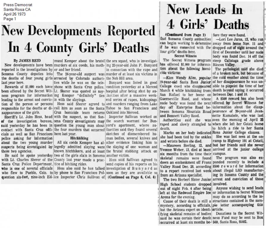 It seems to me that the Greater Bay Area in California like the Houston-Galveston Tx Area had a high number of young girls who were missing or murdered in the 1970s and many of the cases were never solved. The difficulty in solving the cases was that many if not most of the victims engaged in hitchhiking and bodies usually turned up, highly decomposed over a wide geographic area.