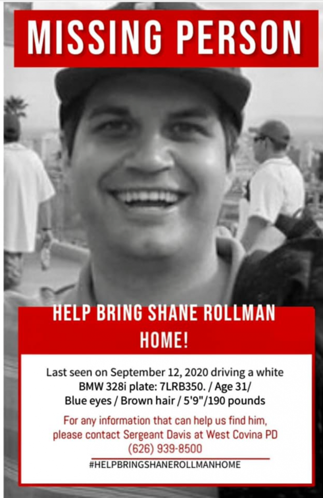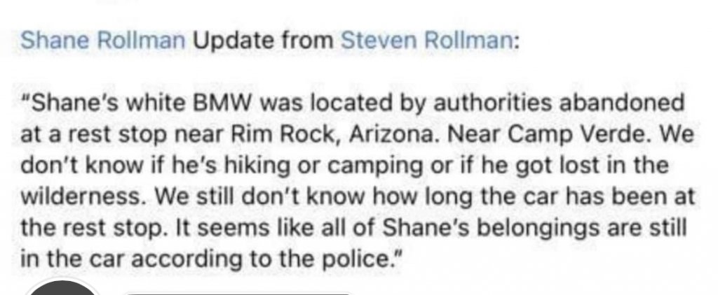 Shane is a 31 y/o male with blue eyes and brown hair. He is 5'9 approx 190lbs. He was last seen in West covina CA Sept 12th. His vehicle was located Sept 23 at a rest stop near Rimrock AZ (McGuireville Rest Area). His family is now on scene and working with LE and SAR.