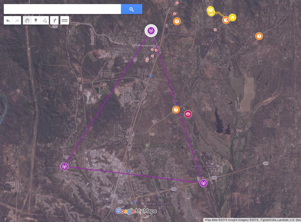 There is actually only 3 towers in the near vicinity. There is a cluster of 3 towers supposed to be just across the road from the bottom right tower but after close inspection and a little research I think they are old. All I see is a big empty field and the towers are registered to a radio company that is listed at a different address now.