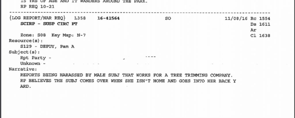 That reminds me. On one of the sheriff's logs I saw that a woman had reported harrassment/possible stalking (?) by a tree trimmer in the area. The log states that the woman believed that he goes into her back yard while she's not home. That rang a bell because I remember her husband saying that some tree trimmers had reported seeing her. I'll see if I can find the log.