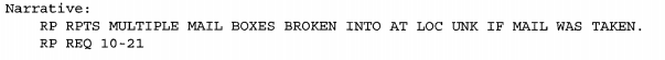 There seems to be quite a few reports each day about "cluster of mailboxes", open mail, stolen mail, lost/found mail, tampering with mailboxes, etc. Is this "normal"? Just seemed odd to me so many reports about mail in one day in an area. Yesterday had a report of