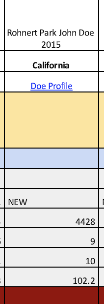 Case History: On 1/2/2015, at approximately 1402 Hrs, the subject was found deceased along the access road that travels parallel to the creek, between Motel 6 and the Rohnert Park Expressway Self Storage, on Commerce Blvd. The subject was a white male, between the ages of 40 to 55 years old. He was 5' 11" and weighed 220 lbs. He had male-pattern baldness, and a full beard. The facial hair on his chin was gray; however the rest of his hair was brown. He wore metal framed prescription aviator style glasses (not sunglasses). The subject was wearing a black Ben Davis 1/2 zip shirt, a brown zippered vest, a camouflage 1/2 zip jacket, black pants, white socks