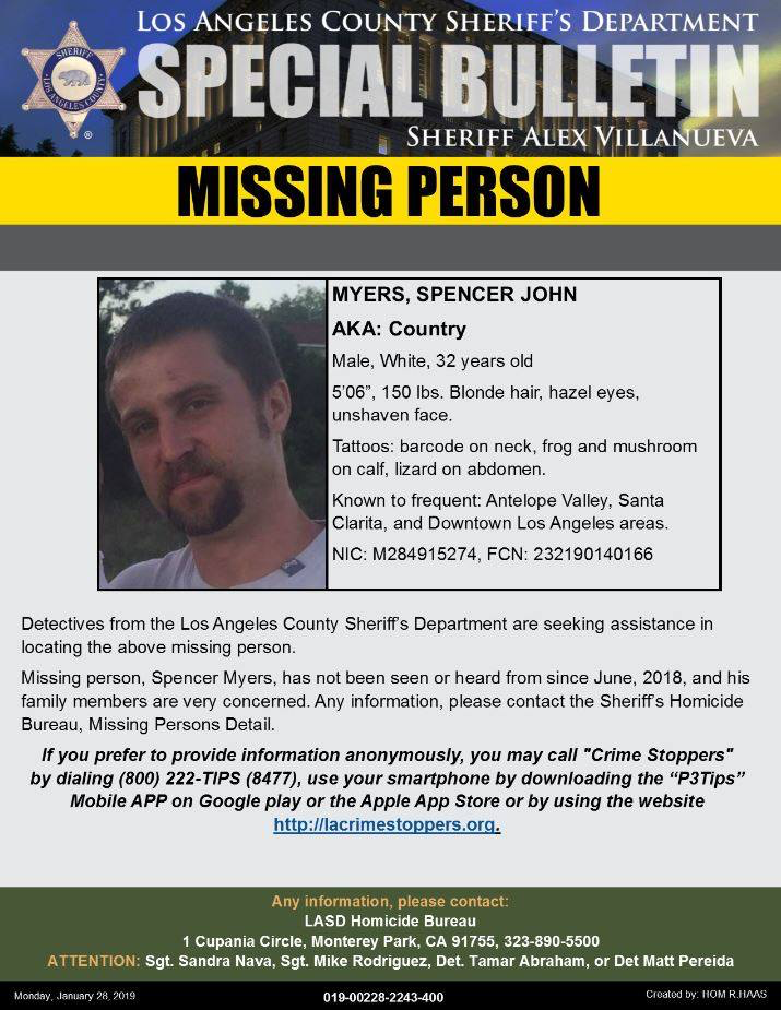 Detectives from Los Angeles County Sheriff’s Department Missing Persons Detail are seeking the public’s assistance in locating Spencer Myers, also known as "Country", a 32 year-old male, White, who has not been seen or heard from since June, 2018.
