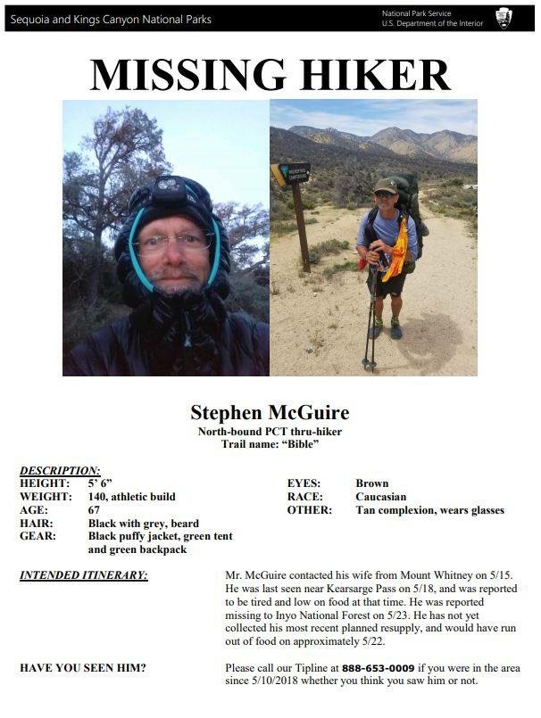 Personnel from the Sequoia and Kings Canyon National Parks are currently working with Inyo National Forest and the NPS Investigative Services Branch to gather information. If you have any information, or if you have hiked between Mt. Whitney and Reds Meadow since Thursday, May 10, whether or not you think you saw Mr. McGuire, please call the tipline at (888) 653-0009.