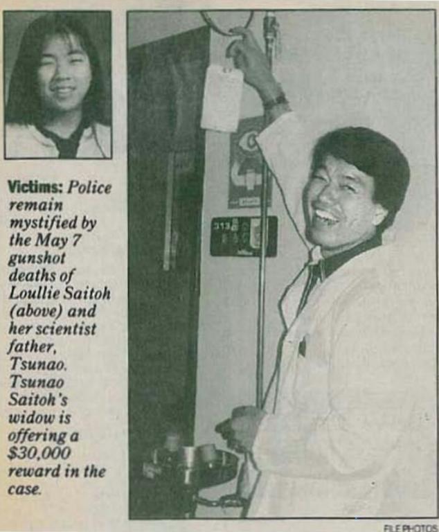 Synopsis: Dr. Tsunao Saitoh was an accomplished and well-respected research neuroscientist at UCSD. On May 8, 1996 at about 11:00 p.m., Dr. Saitoh and his 13-year-old daughter, Loullie, returned home from the research lab on campus. As their car pulled up to the front of their home, an unknown suspect or suspects ambushed Dr. Saitoh and his daughter in the driveway, shooting and killing them both. Neighbors heard the gunshots and passers-by found the bodies a short time afterward. Dr. Saitoh was slumped over in the car and Loullie had run a short distance before being gunned down.