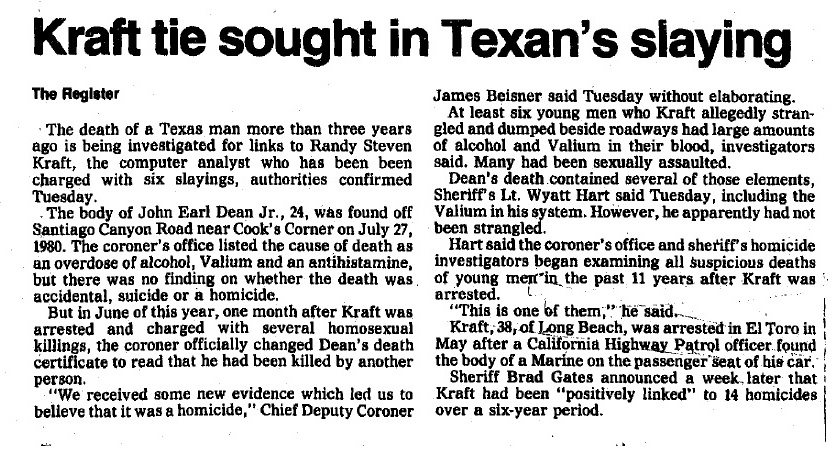 John Earl Dean Jr, 24, originally from Texas, was found dead on Santiago Canyon Road on July 27, 1980 (right after William Bonin was arrested). I found an OC Register article from September 7, 1983 stating that he was being looked at as a possible victim, yet I don't think he was mentioned again (to my knowledge).