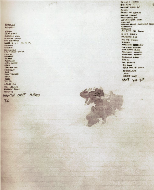 Most of the writing is the same and very small, it looks like it was intended to leave plenty of space for more victims. All except the final few entries HAWTH OFF HEAD and 76 on one side and possibly DART 405 on the other. WHAT YOU GOT appears to have been written in a completely different hand to me.