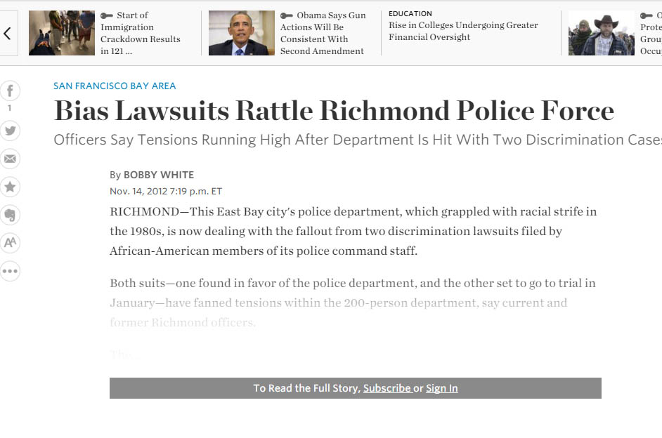 Detective Delon Jackson, a 15-year veteran of Richmond's police force, who isn't involved in the lawsuits, says many officers are torn between supporting the department and their colleagues who sued. "There's a real concern among some officers, particularly among African-American officers, that saying the wrong thing could result in retaliation or jeopardize your career," says Mr. Jackson, who is African-American.