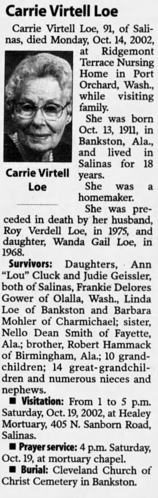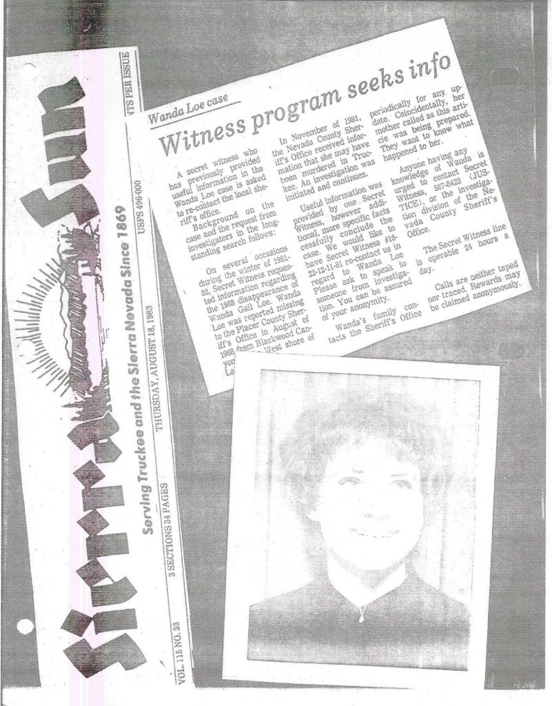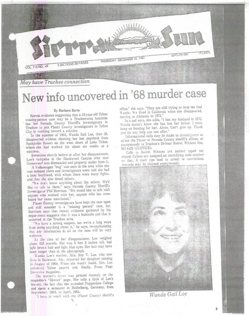Wanda Loe was working at Sunnyside Restaurant and Lodge as a waitress in North Lake Tahoe, when she failed to show up for work and suddenly disappeared. It was also noted that she never picked up her last paycheck nor had picked up her mail for about three weeks. Area checks were made for any evidence of Wanda or her property. Negative results.